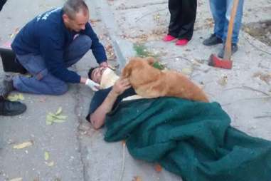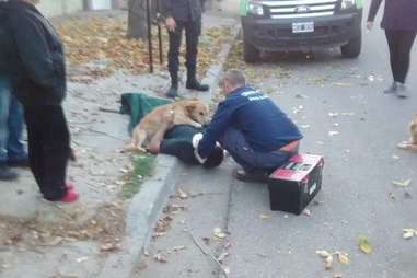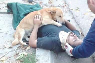 While emergency crews attended to the injured Hueche, fitting him with a neck brace, the dog continued to embrace him and refused to leave his spot.